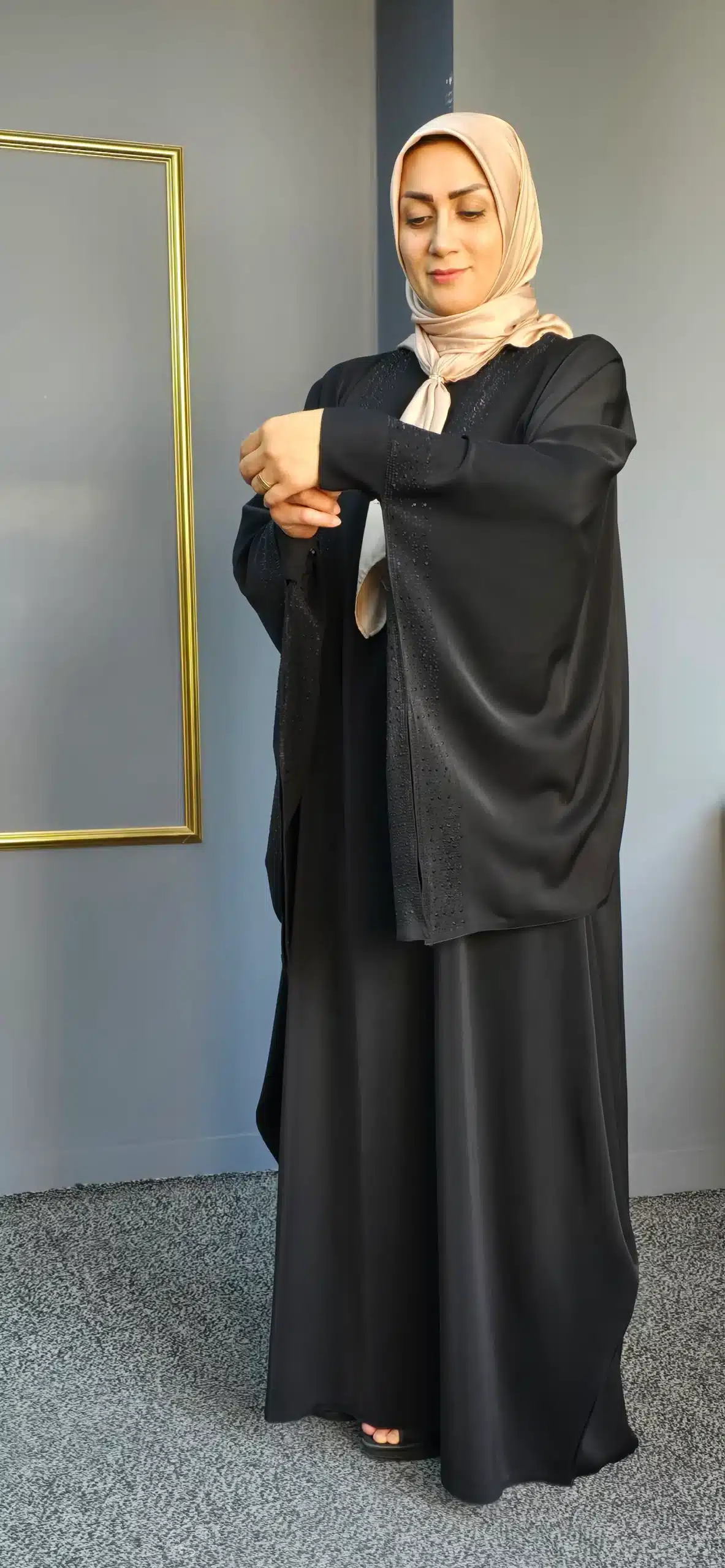 عبای مشکی سیمین دخت با پارچه ژاکلین و نگین پرسی: درخشش ظرافت و شکوه